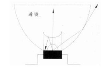 透光率是LED 透镜的一项重要技术参数,直接影响到透镜的使用效果。目前在大功率LED 灯具中通常使用的透镜为全反射式透镜,国内外知名LED 透镜厂家可以将这种透镜的透光率达到89%, 即LED 光源所发出的全部光通量一般有10%以上的损耗。这些损失的光可以被分为三种(见图2): LED 的正上方透镜表面所反射的光、被透镜吸收的光、通过LED 透镜侧面被折射的光。